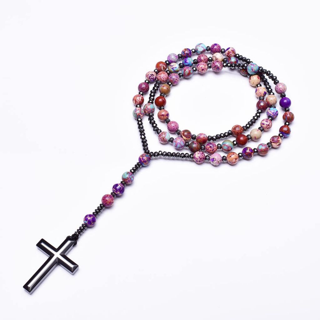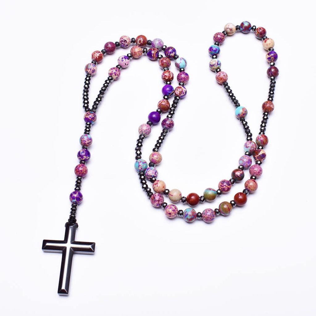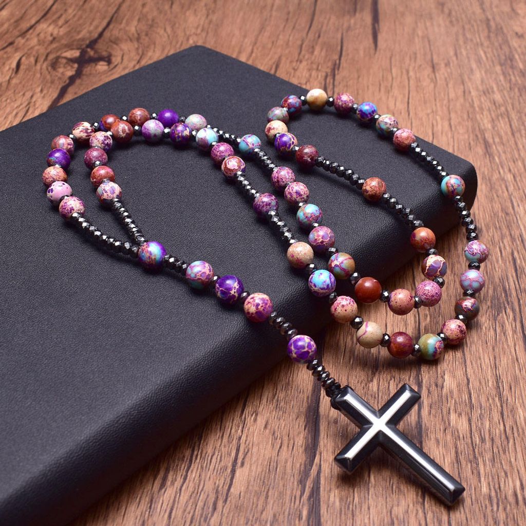 Purple Emperor Stone with Hematite Cross Pendant Necklace for Women Catholic Christ Rosary Prayer Bead Necklaces Female Jewelry